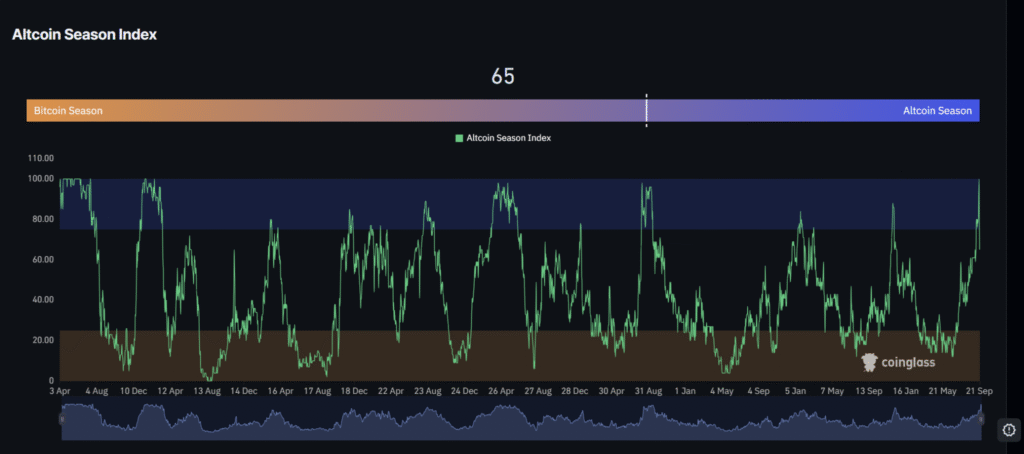 The altcoin season index, which had hit a peak of 100 points just days ago, has now fallen back to 67. This shift underlines how quickly speculative rallies can be undone once leverage unwinds.
